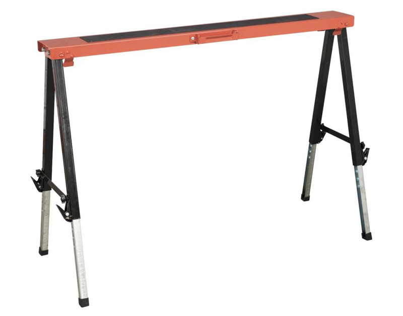 This metal trestle has easy-to-fold, steady feet for all-surface use. With a fast-open mechanism, set-up is straightforward and simple. Powder-coated and zinc-plated steel prevents corrosion and withstands rigorous environments. This folding saw-horse includes an easy carry handle for effortless transport and rolled edges for safety and comfort. It can hold up to 120kg.