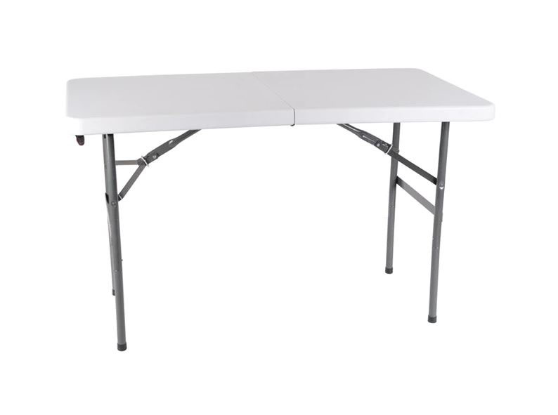 This Brand New four-foot center-fold Table features a white top crafted polyethylene plastic and powder-coated steel frame.